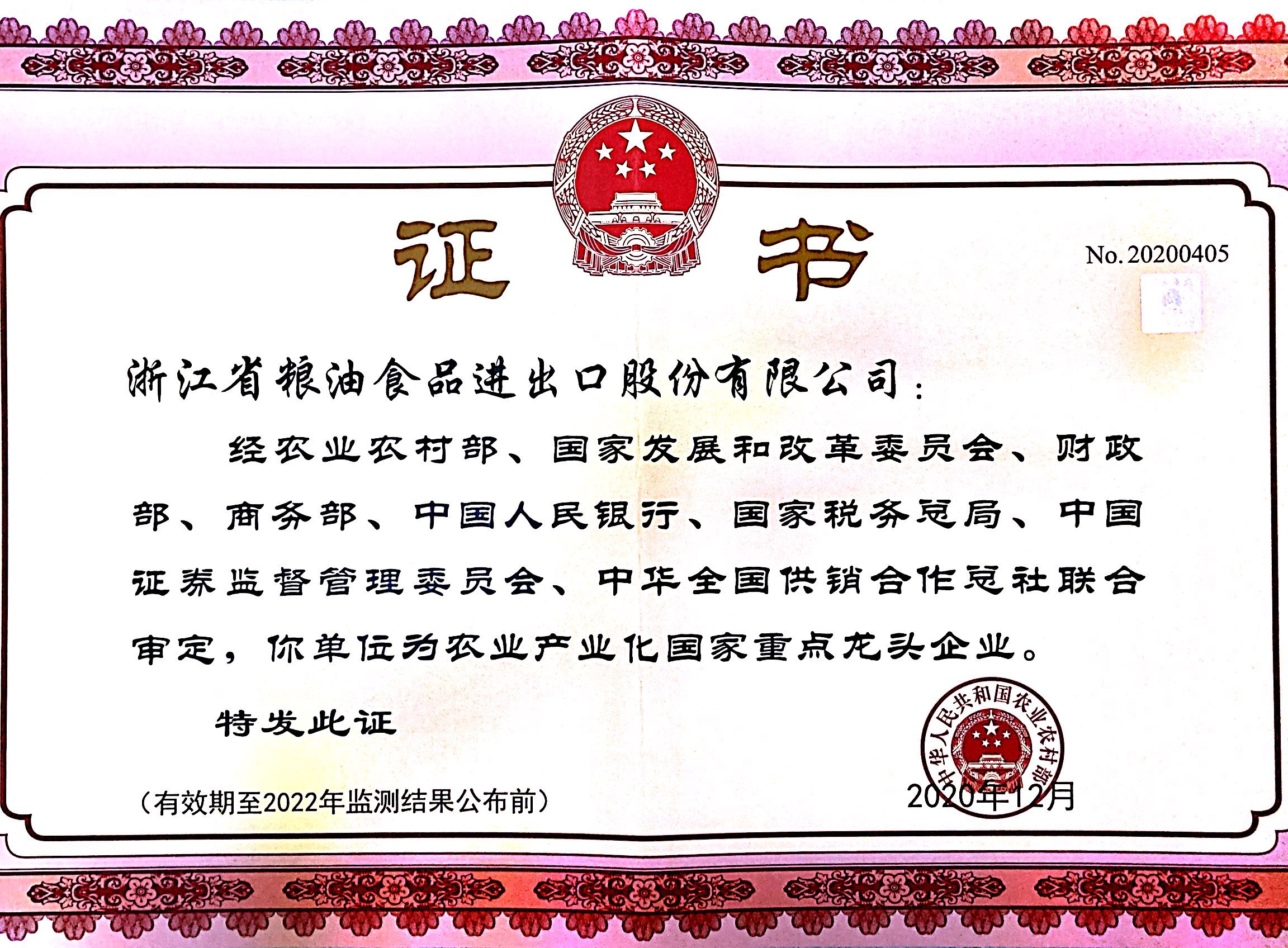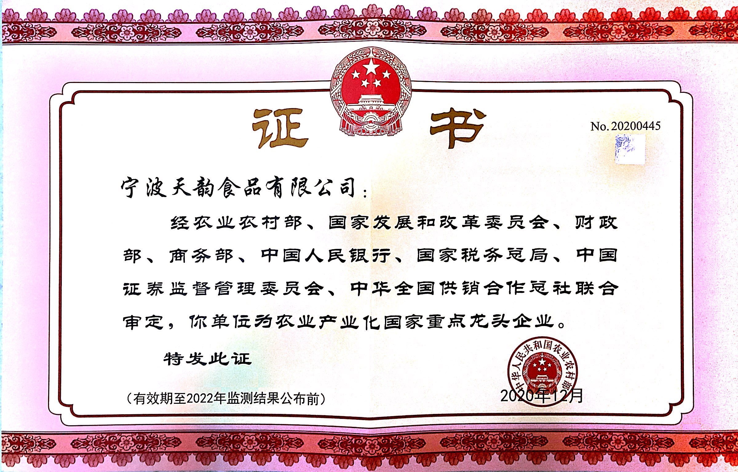近期,經(jīng)農(nóng)業(yè)農(nóng)村部、國家發(fā)展和改革委員會、財政部、商務部、中國人民銀行、國家稅務總局、中國證券監(jiān)督管理委員會、中華全國供銷合作總社聯(lián)合審定,公司與寧波天韻食品有限公司雙雙順利通過第九次農(nóng)業(yè)產(chǎn)業(yè)化國家重點龍頭企業(yè)監(jiān)測復評。